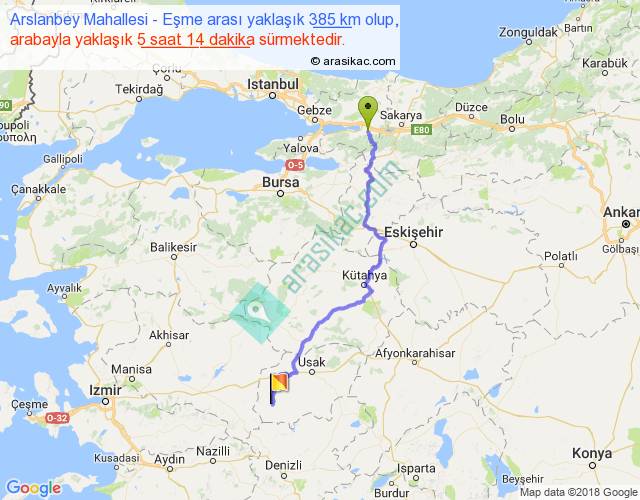 Arslanbey Mahallesi - Eşme arası yaklaşık olarak 90 km/h ile yukarıda belirtilen sürede olup, iki yerin kuş uçuşu uzaklığı (mesafesi) 270'dir. Eğer belirtilen yerler arasında uçak seferi var ise bu süre uçakla 24 dakika'ya kadar düşebilir. Yolculuk otobüsle 6 saat 48 dakika sürmektedir.