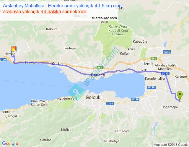 Arslanbey Mahallesi - Hereke arası yaklaşık olarak 90 km/h ile yukarıda belirtilen sürede olup, iki yerin kuş uçuşu uzaklığı (mesafesi) 34'dir. Yolculuk otobüsle 57 dakika sürmektedir.