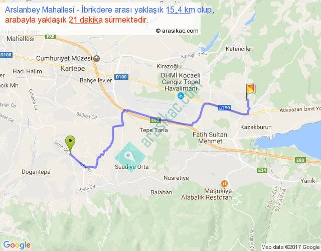 Arslanbey Mahallesi - İbrikdere arası yaklaşık olarak 90 km/h ile yukarıda belirtilen sürede olup, iki yerin kuş uçuşu uzaklığı (mesafesi) 11'dir. Yolculuk otobüsle 27 dakika sürmektedir.