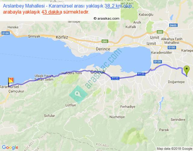 Arslanbey Mahallesi - Karamürsel arası yaklaşık olarak 90 km/h ile yukarıda belirtilen sürede olup, iki yerin kuş uçuşu uzaklığı (mesafesi) 34'dir. Yolculuk otobüsle 55 dakika sürmektedir.
