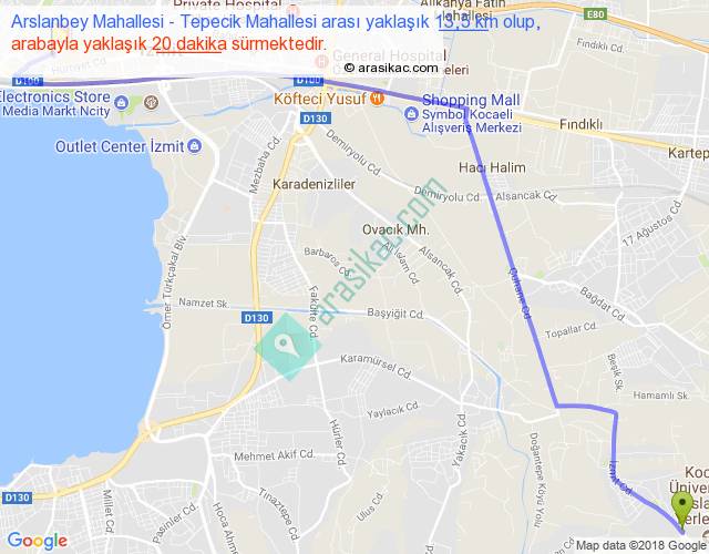 Arslanbey Mahallesi - Tepecik Mahallesi arası yaklaşık olarak 90 km/h ile yukarıda belirtilen sürede olup, iki yerin kuş uçuşu uzaklığı (mesafesi) 10'dir. Yolculuk otobüsle 26 dakika sürmektedir.
