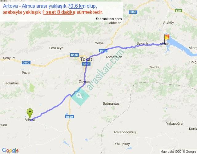 Artova - Almus arası yaklaşık olarak 90 km/h ile yukarıda belirtilen sürede olup, iki yerin kuş uçuşu uzaklığı (mesafesi) 58'dir. Yolculuk otobüsle 1 saat 28 dakika sürmektedir.