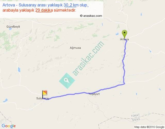 Artova - Sulusaray arası yaklaşık olarak 90 km/h ile yukarıda belirtilen sürede olup, iki yerin kuş uçuşu uzaklığı (mesafesi) 23'dir. Yolculuk otobüsle 37 dakika sürmektedir.