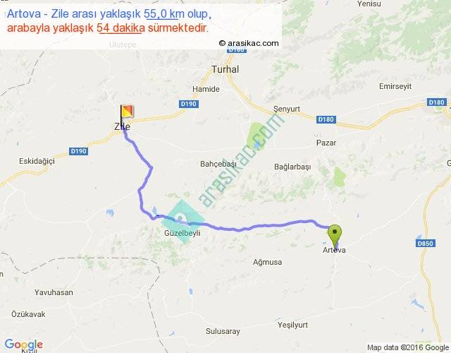 Artova - Zile arası yaklaşık olarak 90 km/h ile yukarıda belirtilen sürede olup, iki yerin kuş uçuşu uzaklığı (mesafesi) 40'dir. Yolculuk otobüsle 1 saat 10 dakika sürmektedir.