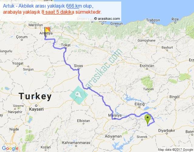Artuk - Akbilek arası yaklaşık olarak 90 km/h ile yukarıda belirtilen sürede olup, iki yerin kuş uçuşu uzaklığı (mesafesi) 420'dir. Eğer belirtilen yerler arasında uçak seferi var ise bu süre uçakla 38 dakika'ya kadar düşebilir. Yolculuk otobüsle 10 saat 30 dakika sürmektedir.