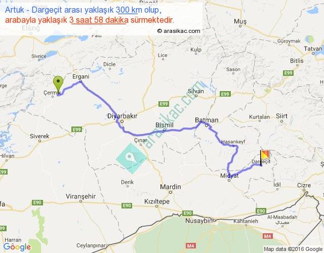 Artuk - Dargeçit arası yaklaşık olarak 90 km/h ile yukarıda belirtilen sürede olup, iki yerin kuş uçuşu uzaklığı (mesafesi) 204'dir. Yolculuk otobüsle 5 saat 9 dakika sürmektedir.