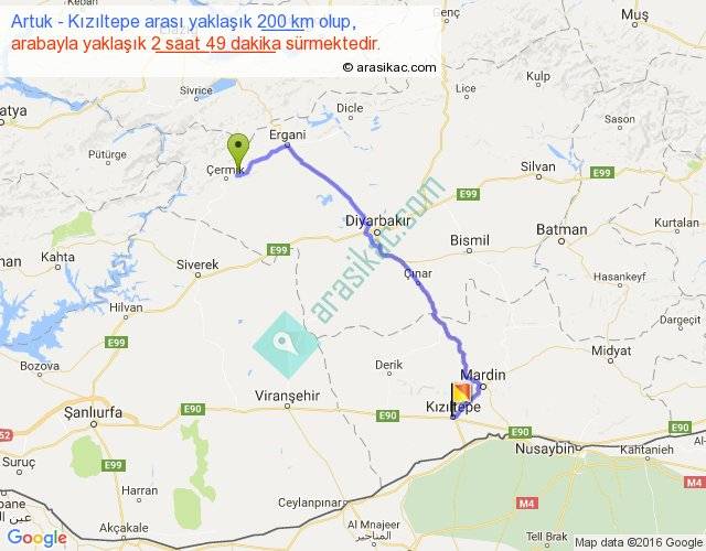 Artuk - Kızıltepe arası yaklaşık olarak 90 km/h ile yukarıda belirtilen sürede olup, iki yerin kuş uçuşu uzaklığı (mesafesi) 142'dir. Yolculuk otobüsle 3 saat 39 dakika sürmektedir.