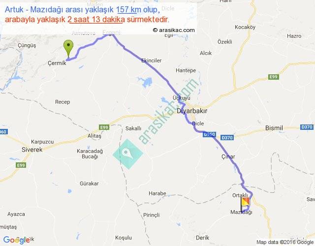 Artuk - Mazıdağı arası yaklaşık olarak 90 km/h ile yukarıda belirtilen sürede olup, iki yerin kuş uçuşu uzaklığı (mesafesi) 113'dir. Yolculuk otobüsle 2 saat 52 dakika sürmektedir.