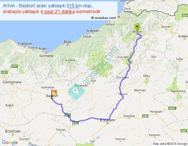 Artvin - Bayburt arası yaklaşık olarak 90 km/h ile yukarıda belirtilen sürede olup, iki yerin kuş uçuşu uzaklığı (mesafesi) 168'dir. Yolculuk otobüsle 5 saat 39 dakika sürmektedir.