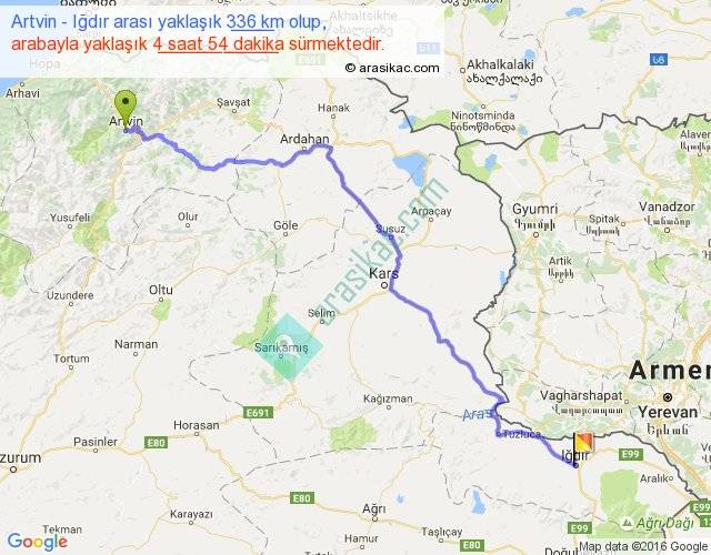 Artvin - Iğdır arası yaklaşık olarak 90 km/h ile yukarıda belirtilen sürede olup, iki yerin kuş uçuşu uzaklığı (mesafesi) 233'dir. Yolculuk otobüsle 6 saat 22 dakika sürmektedir.