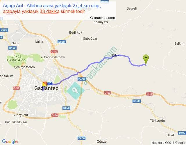 Aşağı Arıl - Alleben arası yaklaşık olarak 90 km/h ile yukarıda belirtilen sürede olup, iki yerin kuş uçuşu uzaklığı (mesafesi) 22'dir. Yolculuk otobüsle 42 dakika sürmektedir.