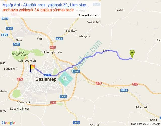 Aşağı Arıl - Atatürk arası yaklaşık olarak 90 km/h ile yukarıda belirtilen sürede olup, iki yerin kuş uçuşu uzaklığı (mesafesi) 24'dir. Yolculuk otobüsle 44 dakika sürmektedir.
