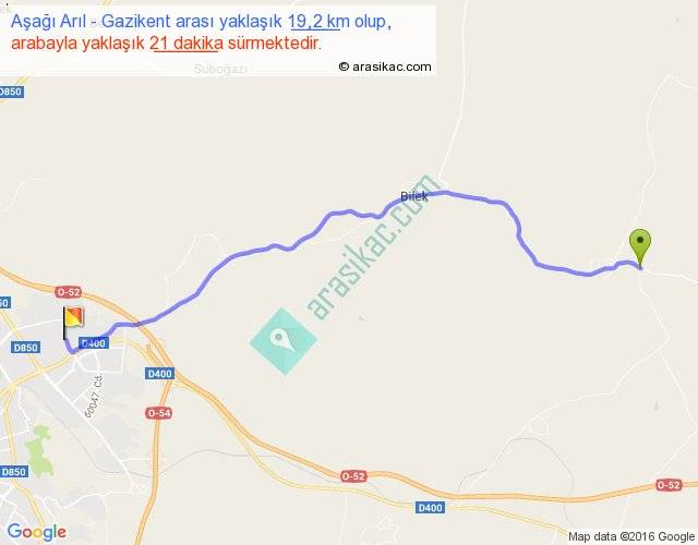 Aşağı Arıl - Gazikent arası yaklaşık olarak 90 km/h ile yukarıda belirtilen sürede olup, iki yerin kuş uçuşu uzaklığı (mesafesi) 16'dir. Yolculuk otobüsle 27 dakika sürmektedir.
