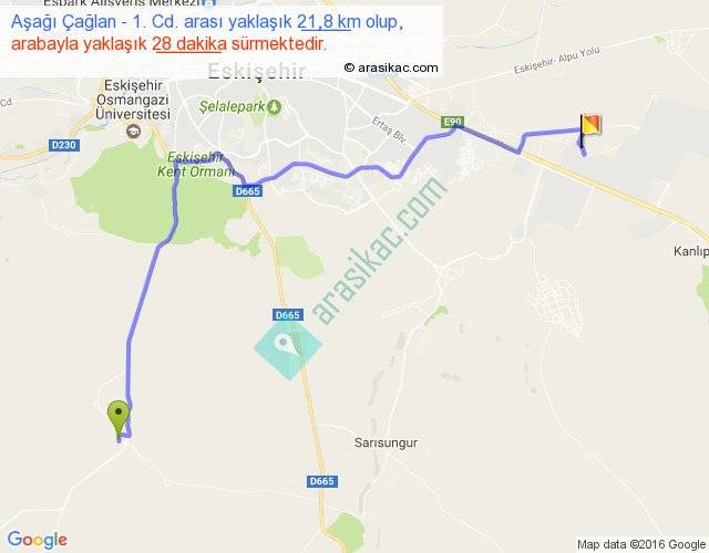 Aşağı Çağlan - 1. Cd. arası yaklaşık olarak 90 km/h ile yukarıda belirtilen sürede olup, iki yerin kuş uçuşu uzaklığı (mesafesi) 14'dir. Yolculuk otobüsle 36 dakika sürmektedir.