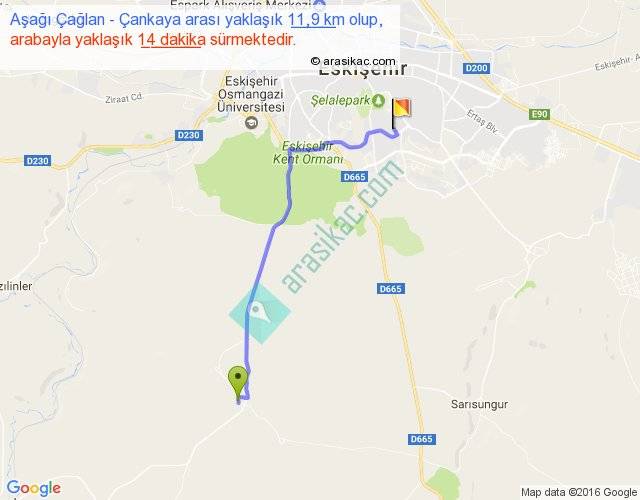 Aşağı Çağlan - Çankaya arası yaklaşık olarak 90 km/h ile yukarıda belirtilen sürede olup, iki yerin kuş uçuşu uzaklığı (mesafesi) 9'dir. Yolculuk otobüsle 18 dakika sürmektedir.