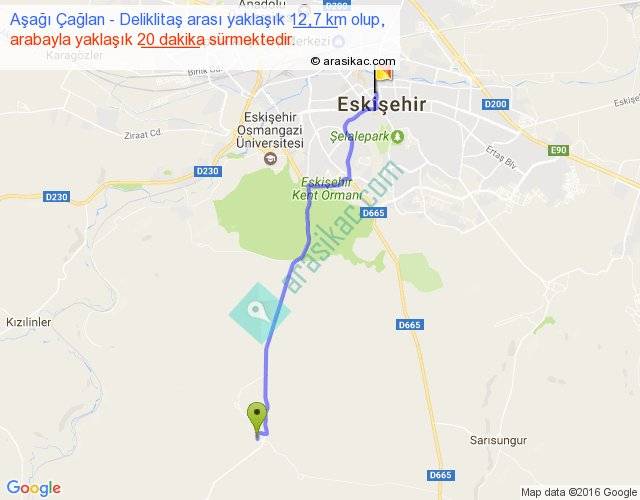 Aşağı Çağlan - Deliklitaş arası yaklaşık olarak 90 km/h ile yukarıda belirtilen sürede olup, iki yerin kuş uçuşu uzaklığı (mesafesi) 11'dir. Yolculuk otobüsle 26 dakika sürmektedir.