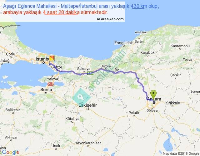 Aşağı Eğlence Mahallesi - Maltepe İstanbul arası yaklaşık olarak 90 km/h ile yukarıda belirtilen sürede olup, iki yerin kuş uçuşu uzaklığı (mesafesi) 327'dir. Eğer belirtilen yerler arasında uçak seferi var ise bu süre uçakla 30 dakika'ya kadar düşebilir. Yolculuk otobüsle 5 saat 48 dakika sürmektedir.