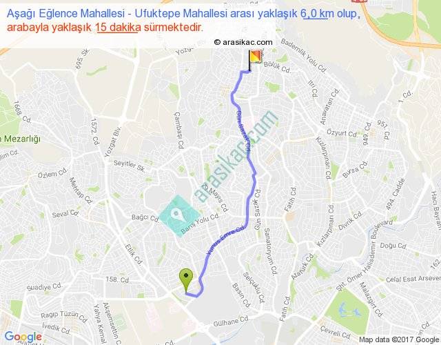 Aşağı Eğlence Mahallesi - Ufuktepe Mahallesi arası yaklaşık olarak 90 km/h ile yukarıda belirtilen sürede olup, iki yerin kuş uçuşu uzaklığı (mesafesi) 5'dir. Yolculuk otobüsle 19 dakika sürmektedir.