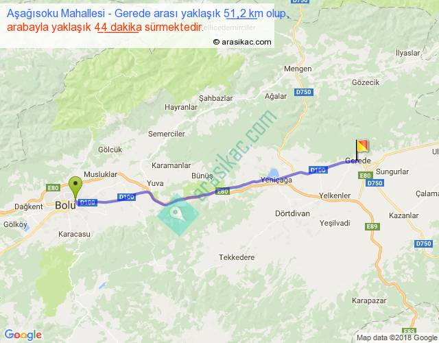 Aşağısoku Mahallesi - Gerede arası yaklaşık olarak 90 km/h ile yukarıda belirtilen sürede olup, iki yerin kuş uçuşu uzaklığı (mesafesi) 48'dir. Yolculuk otobüsle 57 dakika sürmektedir.