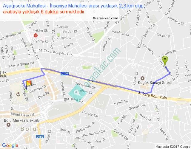 Aşağısoku Mahallesi - İhsaniye Mahallesi arası yaklaşık olarak 90 km/h ile yukarıda belirtilen sürede olup, iki yerin kuş uçuşu uzaklığı (mesafesi) 2'dir. Yolculuk otobüsle 7 dakika sürmektedir.