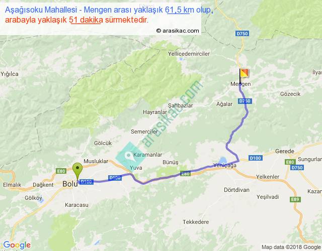 Aşağısoku Mahallesi - Mengen arası yaklaşık olarak 90 km/h ile yukarıda belirtilen sürede olup, iki yerin kuş uçuşu uzaklığı (mesafesi) 43'dir. Yolculuk otobüsle 1 saat 6 dakika sürmektedir.