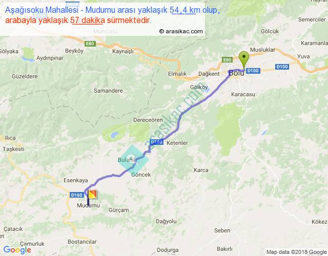 Aşağısoku Mahallesi - Mudurnu arası yaklaşık olarak 90 km/h ile yukarıda belirtilen sürede olup, iki yerin kuş uçuşu uzaklığı (mesafesi) 46'dir. Yolculuk otobüsle 1 saat 14 dakika sürmektedir.