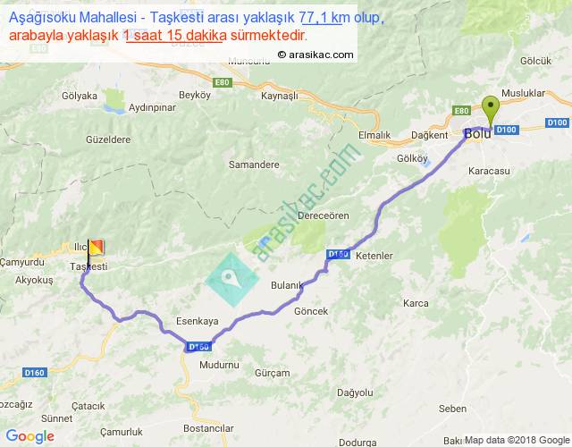 Aşağısoku Mahallesi - Taşkesti arası yaklaşık olarak 90 km/h ile yukarıda belirtilen sürede olup, iki yerin kuş uçuşu uzaklığı (mesafesi) 55'dir. Yolculuk otobüsle 1 saat 37 dakika sürmektedir.