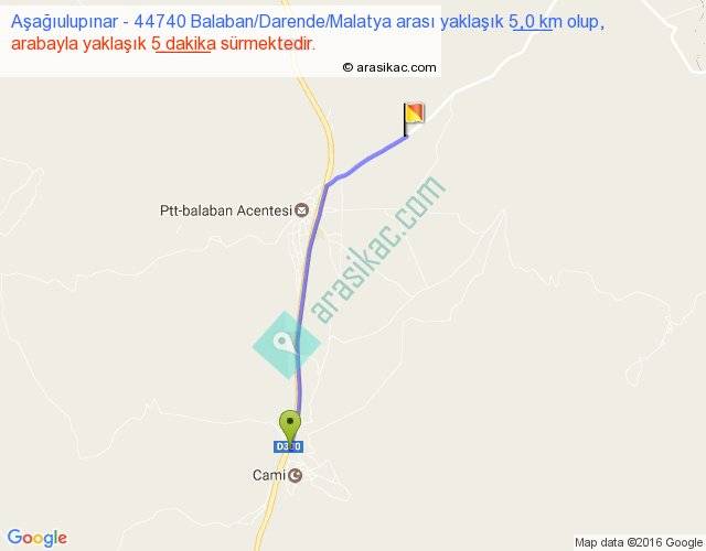 Aşağıulupınar - 44740 Balaban Darende Malatya arası yaklaşık olarak 90 km/h ile yukarıda belirtilen sürede olup, iki yerin kuş uçuşu uzaklığı (mesafesi) 5'dir. Yolculuk otobüsle 6 dakika sürmektedir.