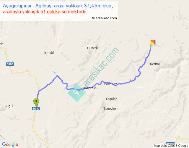 Aşağıulupınar - Ağılbaşı arası yaklaşık olarak 90 km/h ile yukarıda belirtilen sürede olup, iki yerin kuş uçuşu uzaklığı (mesafesi) 26'dir. Yolculuk otobüsle 1 saat 6 dakika sürmektedir.