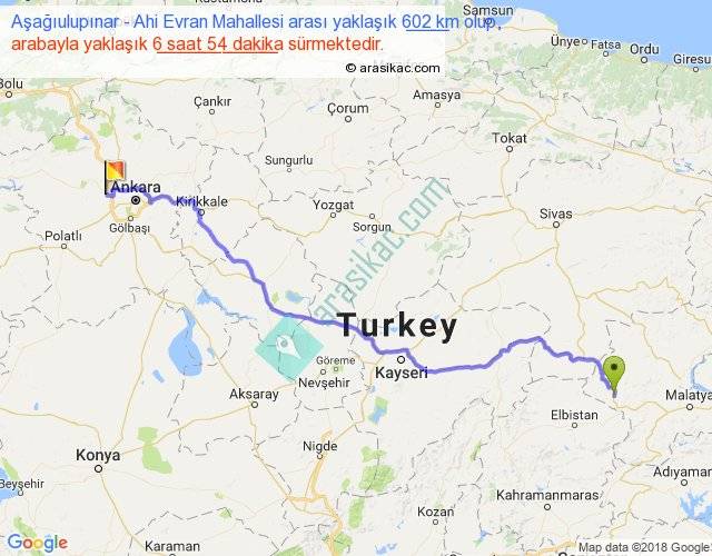 Aşağıulupınar - Ahi Evran Mahallesi arası yaklaşık olarak 90 km/h ile yukarıda belirtilen sürede olup, iki yerin kuş uçuşu uzaklığı (mesafesi) 461'dir. Eğer belirtilen yerler arasında uçak seferi var ise bu süre uçakla 42 dakika'ya kadar düşebilir. Yolculuk otobüsle 8 saat 58 dakika sürmektedir.