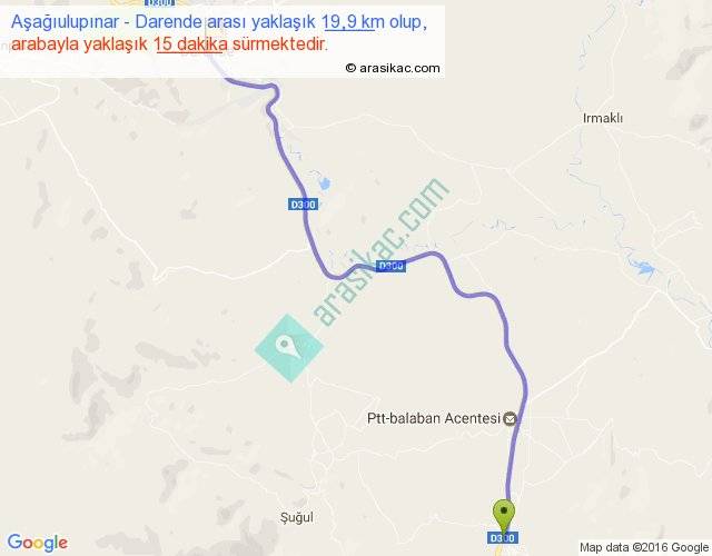 Aşağıulupınar - Darende arası yaklaşık olarak 90 km/h ile yukarıda belirtilen sürede olup, iki yerin kuş uçuşu uzaklığı (mesafesi) 15'dir. Yolculuk otobüsle 19 dakika sürmektedir.