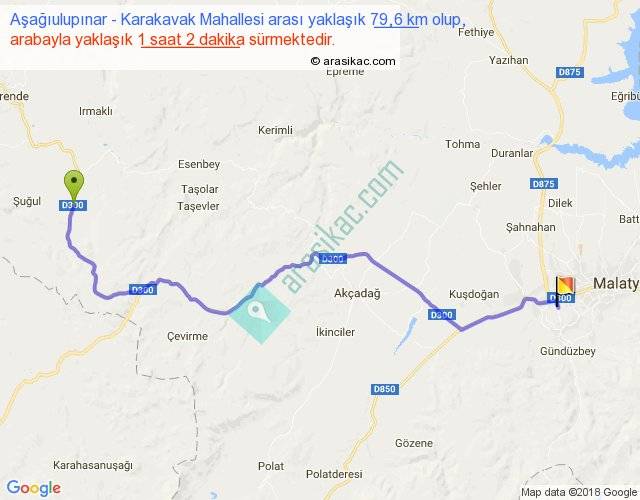 Aşağıulupınar - Karakavak Mahallesi arası yaklaşık olarak 90 km/h ile yukarıda belirtilen sürede olup, iki yerin kuş uçuşu uzaklığı (mesafesi) 59'dir. Yolculuk otobüsle 1 saat 20 dakika sürmektedir.