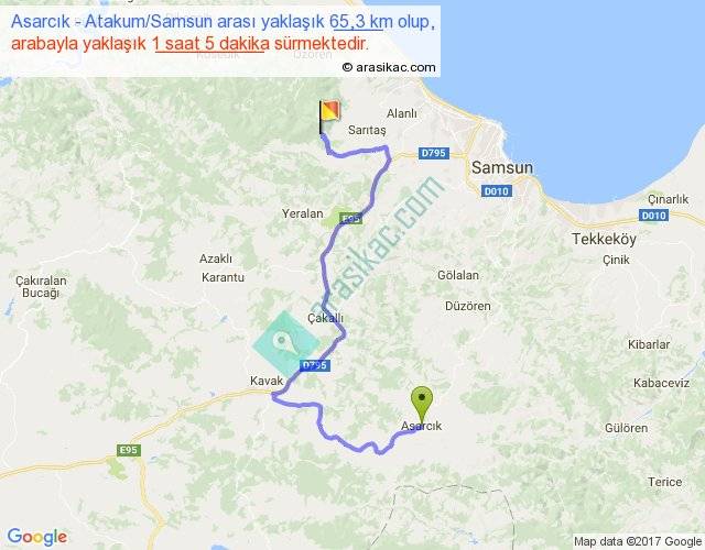 Asarcık - Atakum Samsun arası yaklaşık olarak 90 km/h ile yukarıda belirtilen sürede olup, iki yerin kuş uçuşu uzaklığı (mesafesi) 32'dir. Yolculuk otobüsle 1 saat 23 dakika sürmektedir.