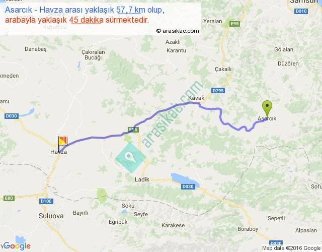 Asarcık - Havza arası yaklaşık olarak 90 km/h ile yukarıda belirtilen sürede olup, iki yerin kuş uçuşu uzaklığı (mesafesi) 48'dir. Yolculuk otobüsle 58 dakika sürmektedir.