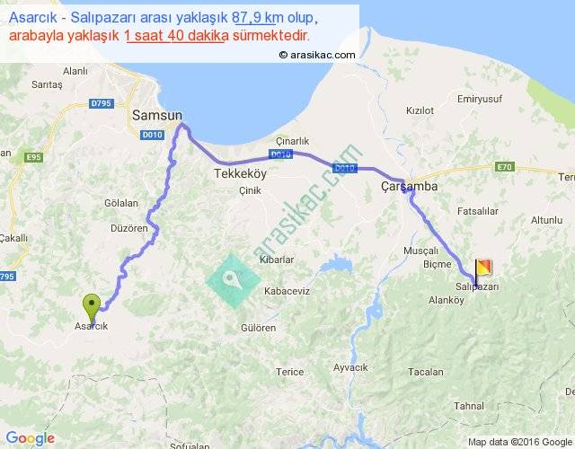 Asarcık - Salıpazarı arası yaklaşık olarak 90 km/h ile yukarıda belirtilen sürede olup, iki yerin kuş uçuşu uzaklığı (mesafesi) 49'dir. Yolculuk otobüsle 2 saat 10 dakika sürmektedir.