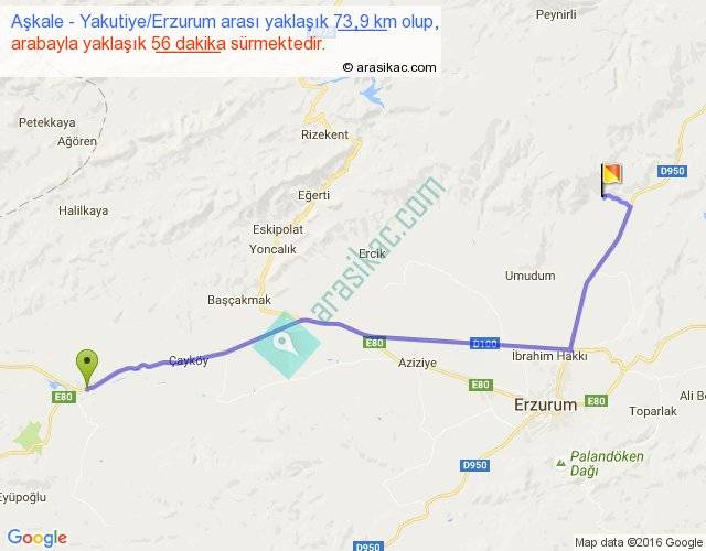Aşkale - Yakutiye Erzurum arası yaklaşık olarak 90 km/h ile yukarıda belirtilen sürede olup, iki yerin kuş uçuşu uzaklığı (mesafesi) 58'dir. Yolculuk otobüsle 1 saat 12 dakika sürmektedir.