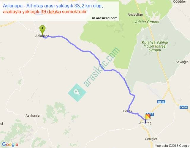 Aslanapa - Altıntaş arası yaklaşık olarak 90 km/h ile yukarıda belirtilen sürede olup, iki yerin kuş uçuşu uzaklığı (mesafesi) 27'dir. Yolculuk otobüsle 50 dakika sürmektedir.