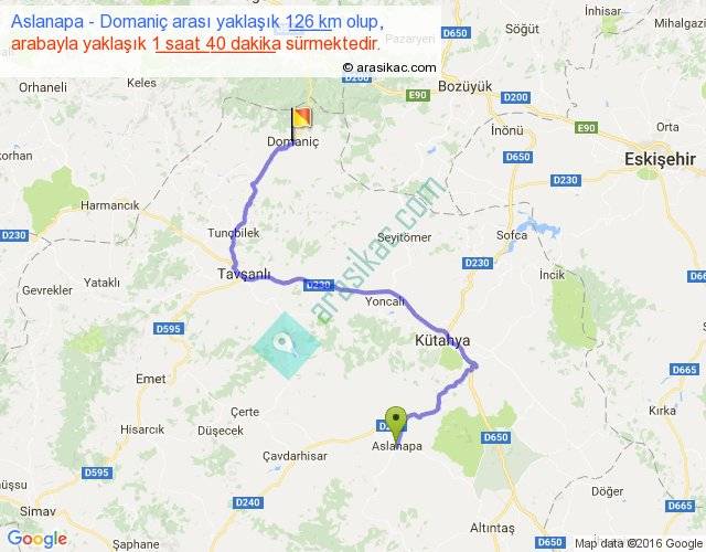 Aslanapa - Domaniç arası yaklaşık olarak 90 km/h ile yukarıda belirtilen sürede olup, iki yerin kuş uçuşu uzaklığı (mesafesi) 68'dir. Yolculuk otobüsle 2 saat 10 dakika sürmektedir.