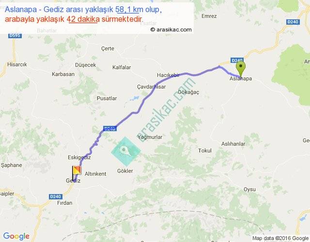 Aslanapa - Gediz arası yaklaşık olarak 90 km/h ile yukarıda belirtilen sürede olup, iki yerin kuş uçuşu uzaklığı (mesafesi) 48'dir. Yolculuk otobüsle 54 dakika sürmektedir.