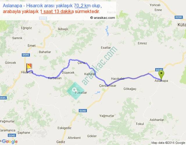 Aslanapa - Hisarcık arası yaklaşık olarak 90 km/h ile yukarıda belirtilen sürede olup, iki yerin kuş uçuşu uzaklığı (mesafesi) 54'dir. Yolculuk otobüsle 1 saat 34 dakika sürmektedir.