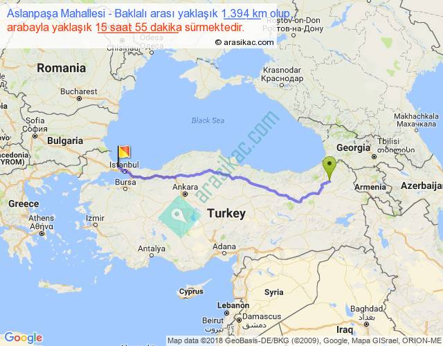 Aslanpaşa Mahallesi - Baklalı arası yaklaşık olarak 90 km/h ile yukarıda belirtilen sürede olup, iki yerin kuş uçuşu uzaklığı (mesafesi) 1117'dir. Eğer belirtilen yerler arasında uçak seferi var ise bu süre uçakla 1 saat 43 dakika'ya kadar düşebilir. Yolculuk otobüsle 20 saat 41 dakika sürmektedir.