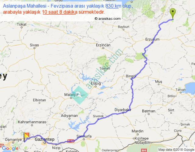 Aslanpaşa Mahallesi - Fevzipasa arası yaklaşık olarak 90 km/h ile yukarıda belirtilen sürede olup, iki yerin kuş uçuşu uzaklığı (mesafesi) 598'dir. Eğer belirtilen yerler arasında uçak seferi var ise bu süre uçakla 55 dakika'ya kadar düşebilir. Yolculuk otobüsle 13 saat 10 dakika sürmektedir.