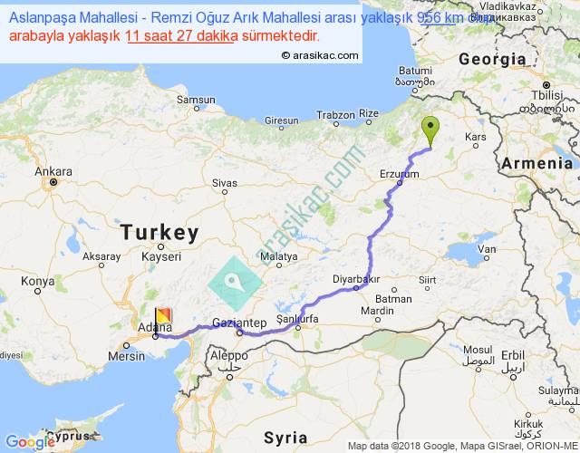 Aslanpaşa Mahallesi - Remzi Oğuz Arık Mahallesi arası yaklaşık olarak 90 km/h ile yukarıda belirtilen sürede olup, iki yerin kuş uçuşu uzaklığı (mesafesi) 691'dir. Eğer belirtilen yerler arasında uçak seferi var ise bu süre uçakla 1 saat 03 dakika'ya kadar düşebilir. Yolculuk otobüsle 14 saat 53 dakika sürmektedir.