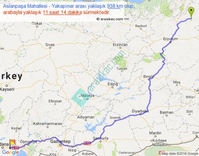 Aslanpaşa Mahallesi - Yakapınar arası yaklaşık olarak 90 km/h ile yukarıda belirtilen sürede olup, iki yerin kuş uçuşu uzaklığı (mesafesi) 679'dir. Eğer belirtilen yerler arasında uçak seferi var ise bu süre uçakla 1 saat 02 dakika'ya kadar düşebilir. Yolculuk otobüsle 14 saat 36 dakika sürmektedir.