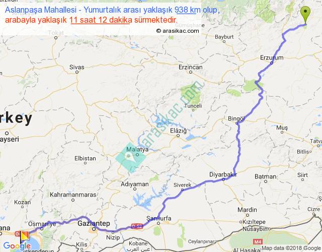 Aslanpaşa Mahallesi - Yumurtalık arası yaklaşık olarak 90 km/h ile yukarıda belirtilen sürede olup, iki yerin kuş uçuşu uzaklığı (mesafesi) 680'dir. Eğer belirtilen yerler arasında uçak seferi var ise bu süre uçakla 1 saat 02 dakika'ya kadar düşebilir. Yolculuk otobüsle 14 saat 33 dakika sürmektedir.