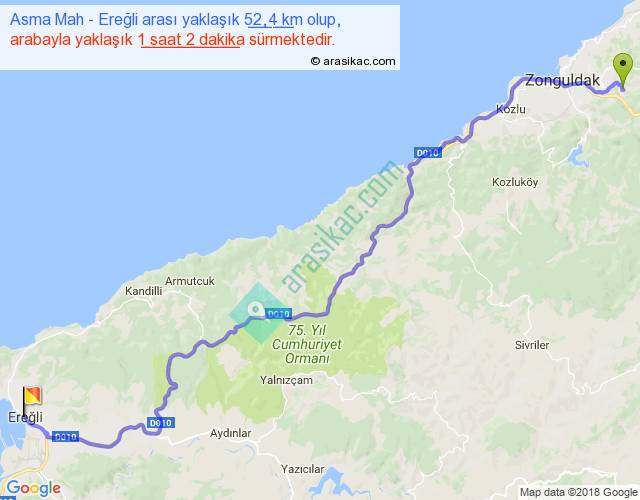 Asma Mah - Ereğli arası yaklaşık olarak 90 km/h ile yukarıda belirtilen sürede olup, iki yerin kuş uçuşu uzaklığı (mesafesi) 39'dir. Yolculuk otobüsle 1 saat 20 dakika sürmektedir.