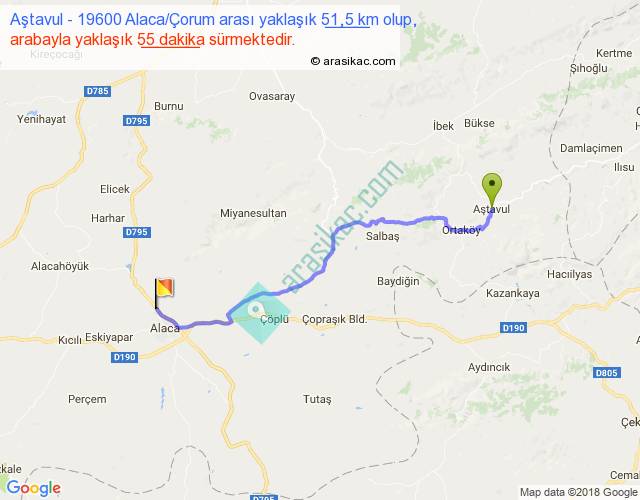 Aştavul - 19600 Alaca Çorum arası yaklaşık olarak 90 km/h ile yukarıda belirtilen sürede olup, iki yerin kuş uçuşu uzaklığı (mesafesi) 41'dir. Yolculuk otobüsle 1 saat 11 dakika sürmektedir.