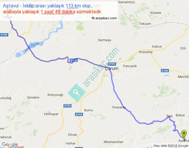 Aştavul - İskilip arası yaklaşık olarak 90 km/h ile yukarıda belirtilen sürede olup, iki yerin kuş uçuşu uzaklığı (mesafesi) 84'dir. Yolculuk otobüsle 2 saat 20 dakika sürmektedir.