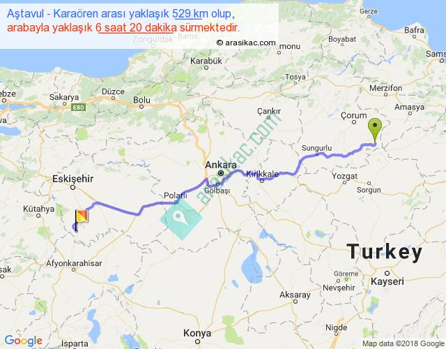 Aştavul - Karaören arası yaklaşık olarak 90 km/h ile yukarıda belirtilen sürede olup, iki yerin kuş uçuşu uzaklığı (mesafesi) 417'dir. Eğer belirtilen yerler arasında uçak seferi var ise bu süre uçakla 38 dakika'ya kadar düşebilir. Yolculuk otobüsle 8 saat 14 dakika sürmektedir.