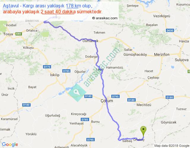 Aştavul - Kargı arası yaklaşık olarak 90 km/h ile yukarıda belirtilen sürede olup, iki yerin kuş uçuşu uzaklığı (mesafesi) 115'dir. Yolculuk otobüsle 3 saat 28 dakika sürmektedir.